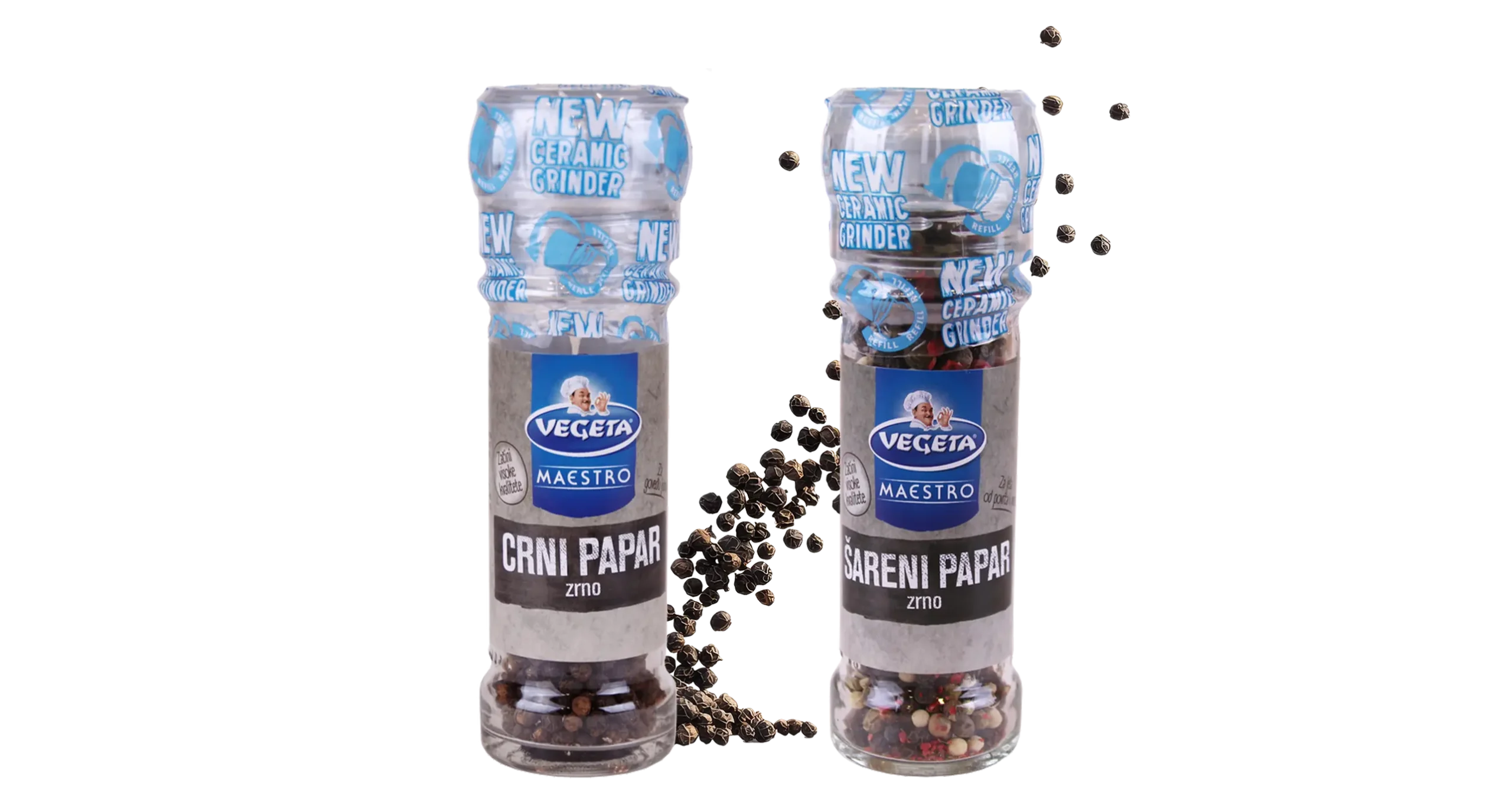 Prelazak s konvencionalnih plastičnih mlinaca na keramički model za Vegeta Maestro predstavlja velik korak naprijed. Morska sol je začin koji koristiš gotovo svakodnevno, a u keramičkom mlincu čuva esenciju mora i čini svaki zalogaj ribljih tacosa, pilećeg ragua ili sočnog brancina boljim. Oštar, pun okusa i uvijek u pravom trenutku, crni papar u keramičkom mlincu tu je kad poželiš začiniti jela kao što su nadjevene lignje ili topla salata s porilukom poput pravog majstora kuhinje.